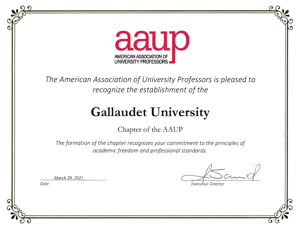 Gallaudet has had AAUP members for many years, including an AAUP Chair. In previous decades, the AAUP Chair gave a regular report during Faculty Senate meetings. However, to the best of our and the National AAUP’s research, Gallaudet faculty had not established an official chapter until now.