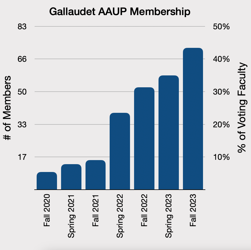 Gallaudet AAUP membership has grown steadily since our chapter became official in March, 2021. Membership is confidential. AAUP National and our AAUP Chapter will never disclose names. For more information, see our FAQ.